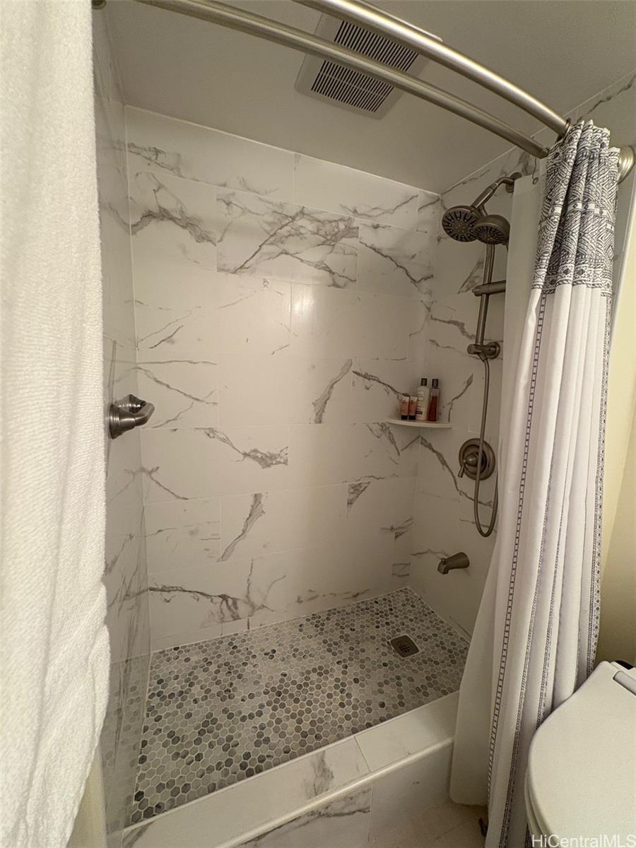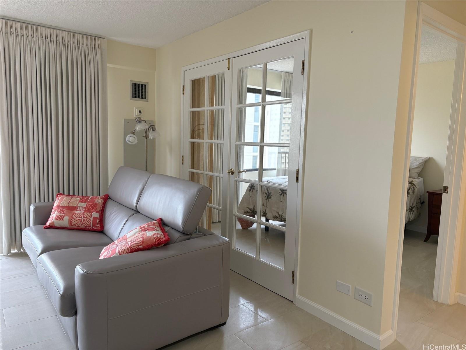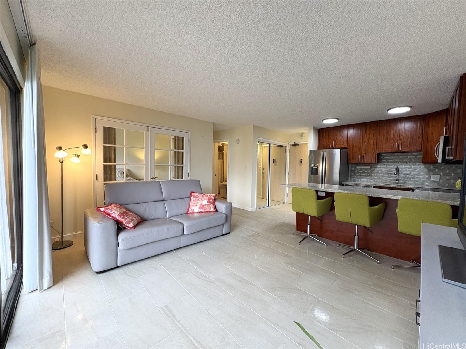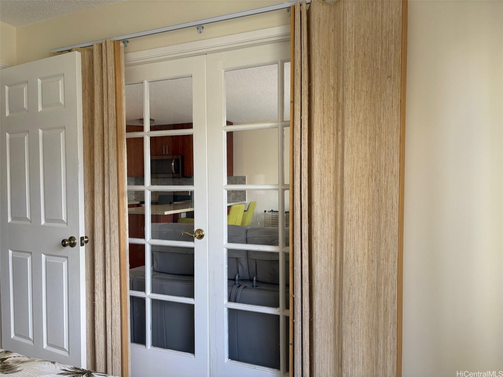FRENCH DOORS enhance access between Living area and bedroom to provide flexible living space. Decorator woven door coverings in Bedroom allow versatility for privacy or opening to Living Room. Open kitchen with Granite counter bar features stainless steel sink and appliances, warm wood cabinetry, ceramic tile backsplash and new lighting. Bathroom updated with shower and upgraded fixtures and enjoys a Toto washlet toilet. Drapes with sunblock lining in LR and Bedroom, closet shelving in entry and bathroom are a few other additions included in the extensive renovation and upgrades done since 2019.