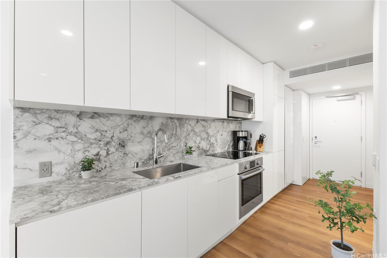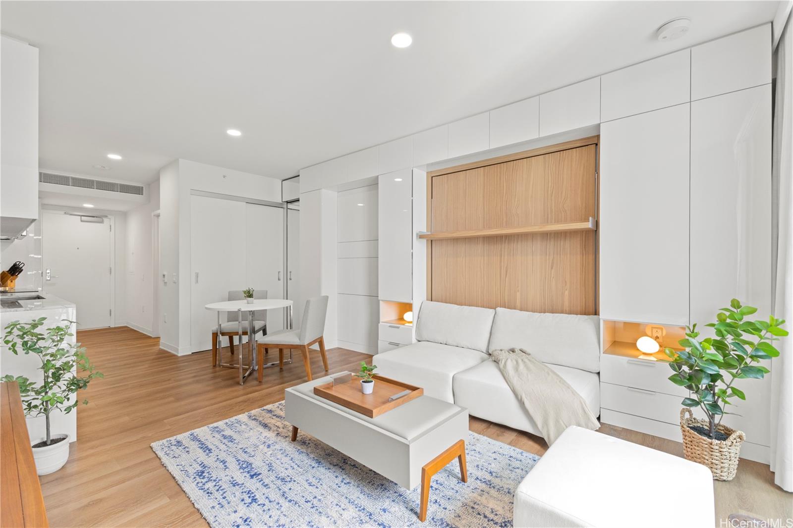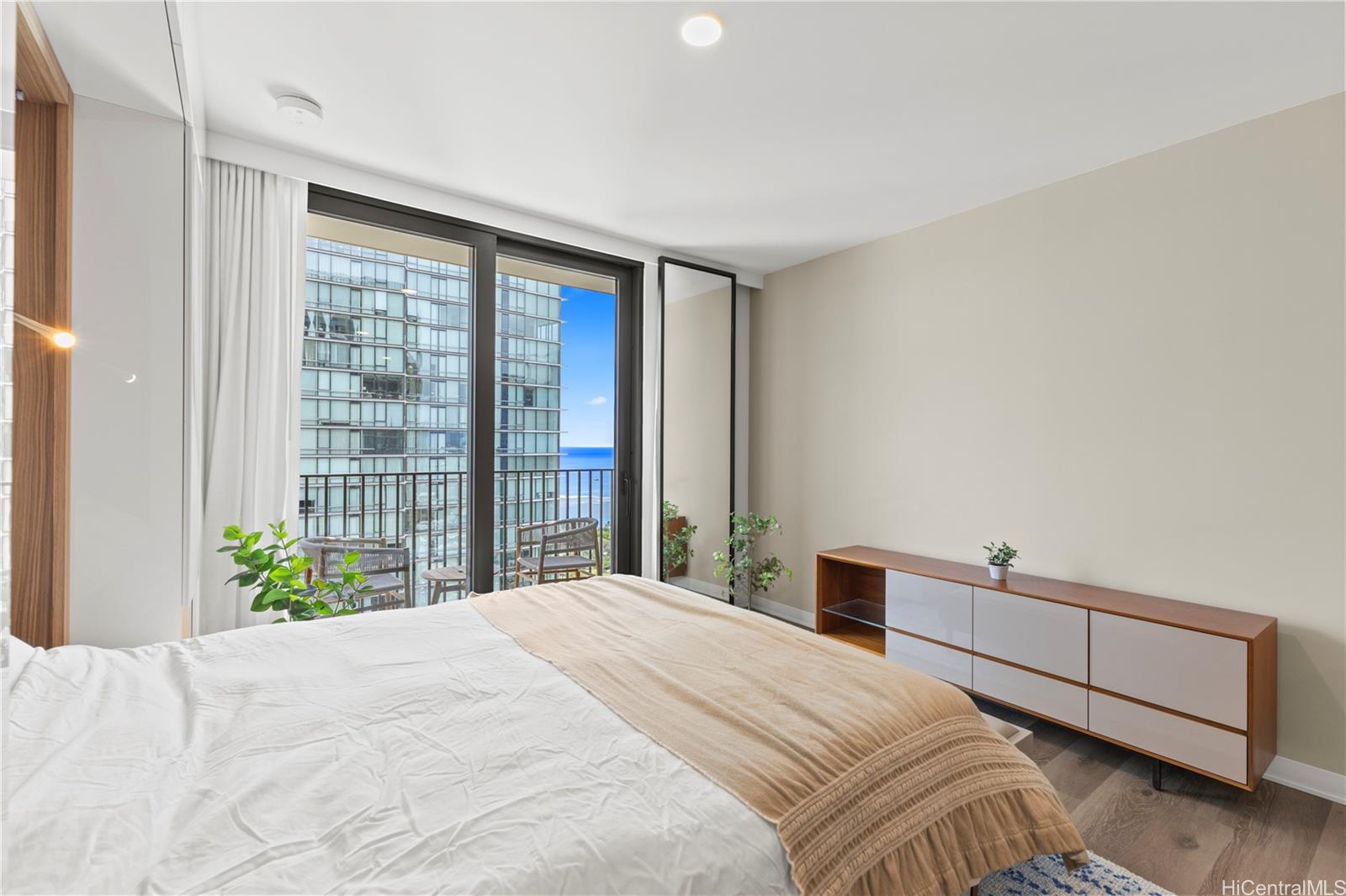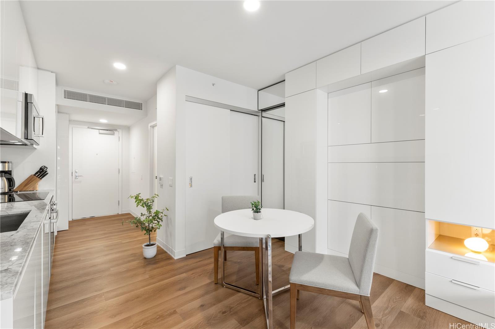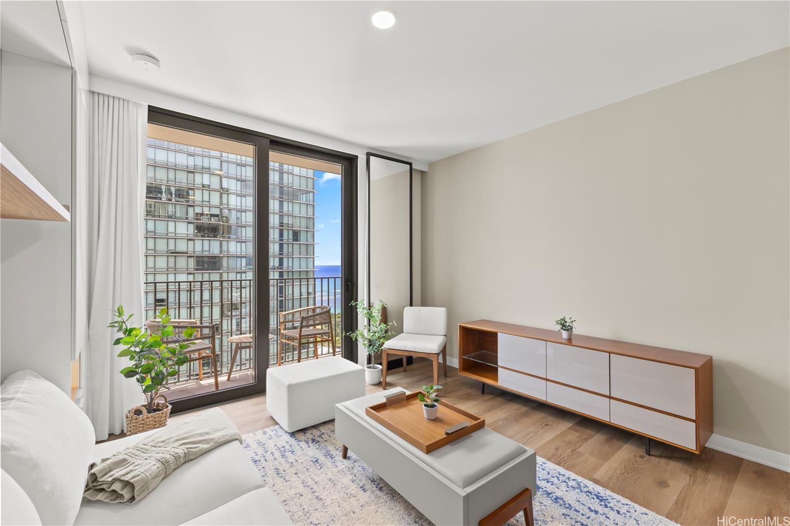 This fully furnished studio with ocean & city views is located in the growing Ward Village area. Aalii offers resort-style amenities. The Sky Lounge on the 42nd floor presents a breathtaking view of the Honolulu skyline with a fitness center, and a yoga room. There is also a swimming pool, jacuzzi, BBQ cabanas on the 8th floor. The little ones can enjoy the keiki pool and playground, while your pets can enjoy the dog run. The Ward village is near by and is walkable, and bike-friendly. Whole Foods, various restaurants, theaters, and shops are all in walking distance. Artificial plants are not part of the sale. All other inventory remains.