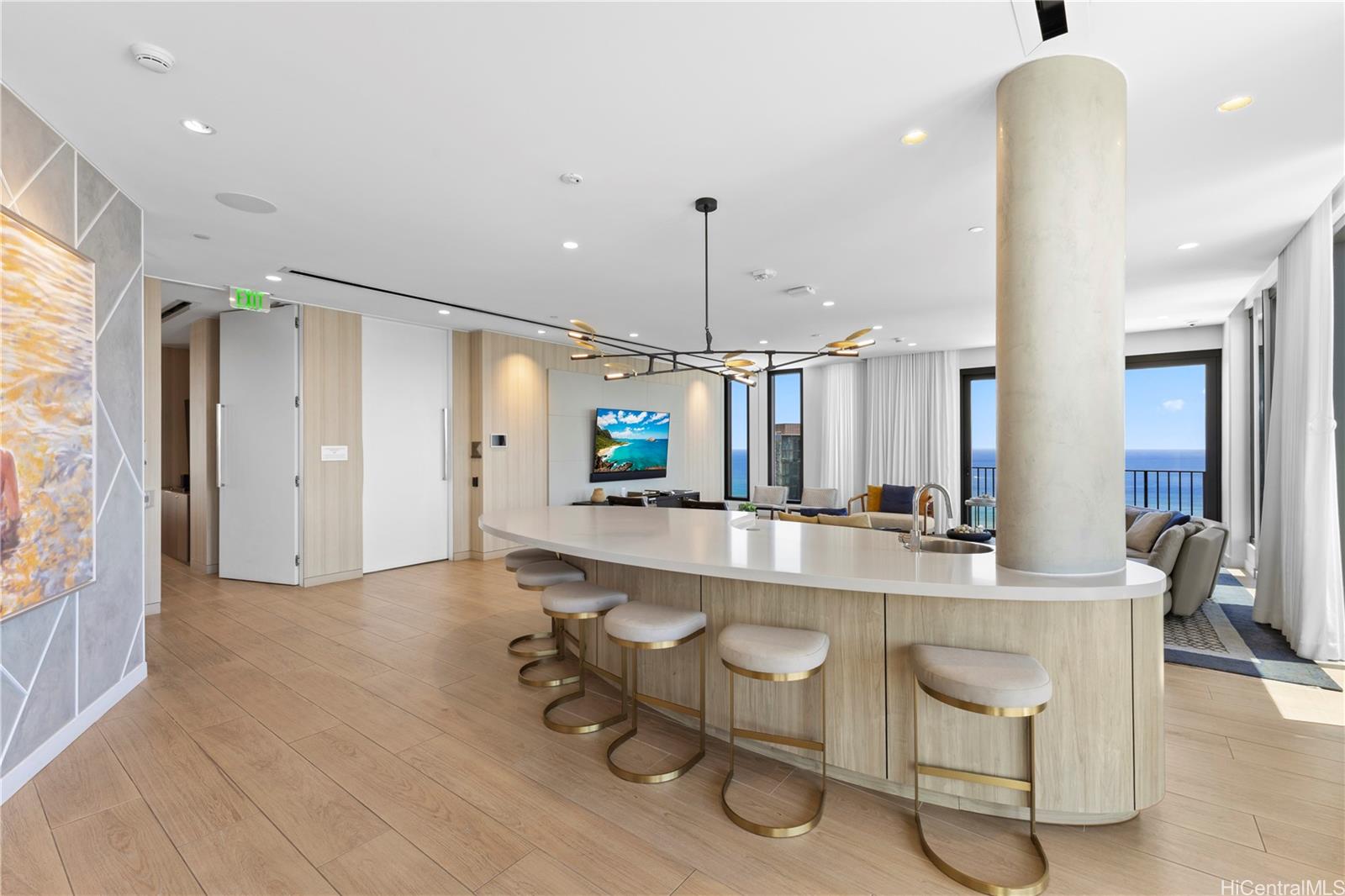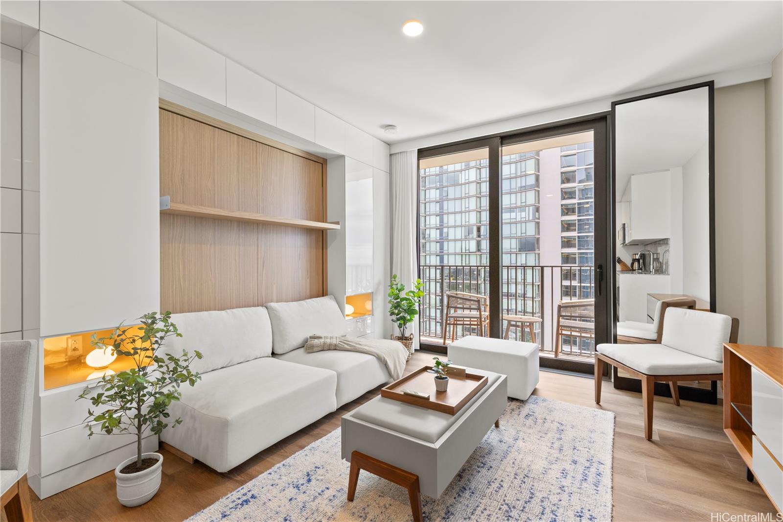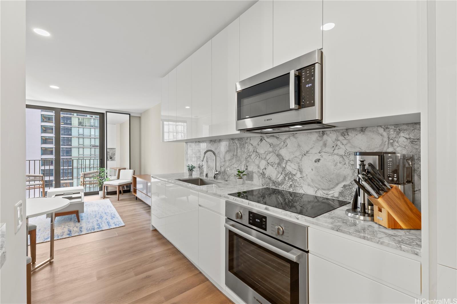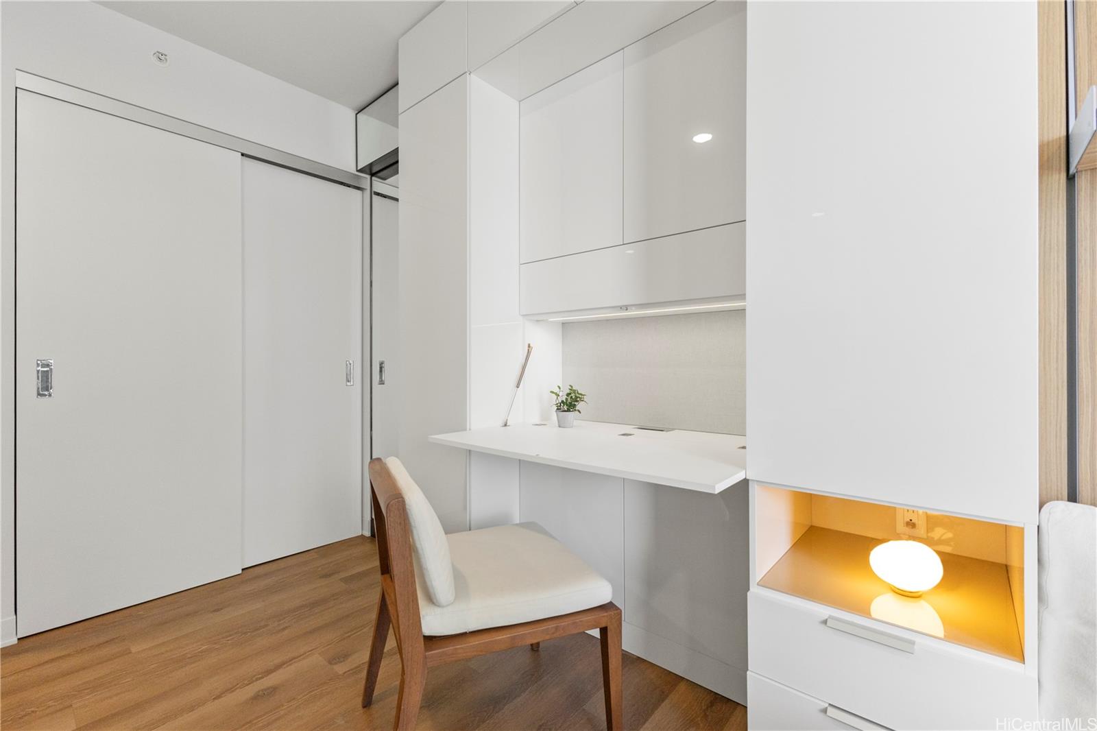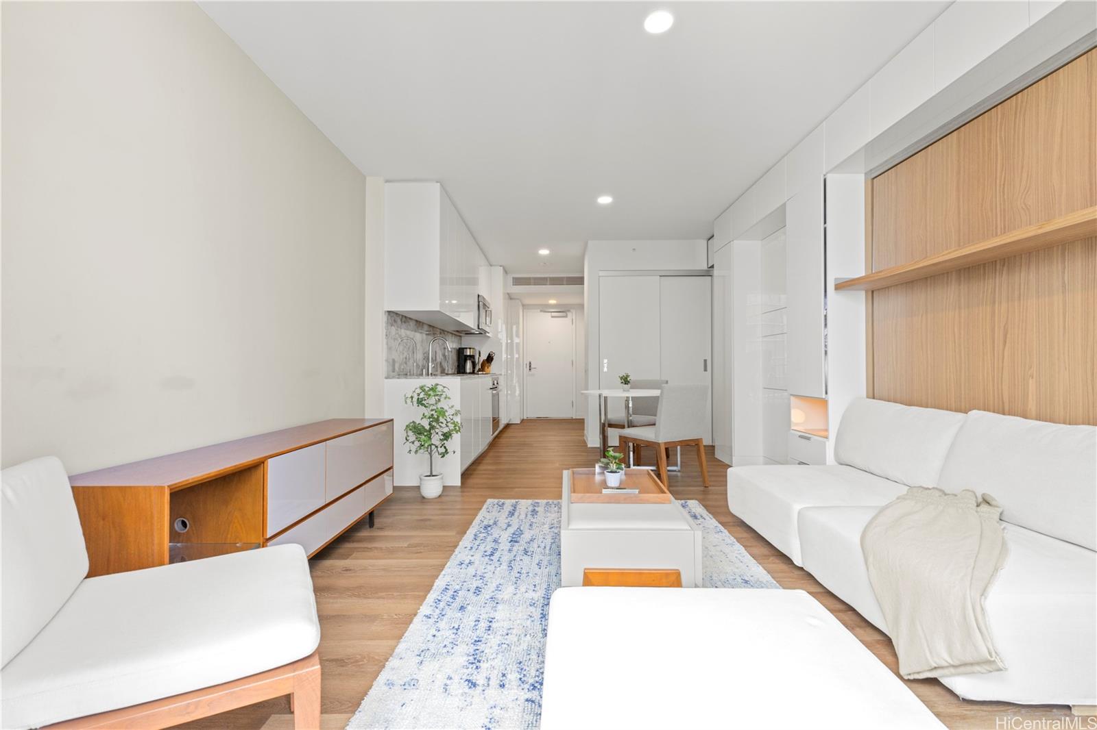 This fully furnished studio with ocean & city views is located in the growing Ward Village area. Aalii offers resort-style amenities. The Sky Lounge on the 42nd floor presents a breathtaking view of the Honolulu skyline with a fitness center, and a yoga room. There is also a swimming pool, jacuzzi, BBQ cabanas on the 8th floor. The little ones can enjoy the keiki pool and playground, while your pets can enjoy the dog run. The Ward village is near by and is walkable, and bike-friendly. Whole Foods, various restaurants, theaters, and shops are all in walking distance. Artificial plants are not part of the sale. All other inventory remains.