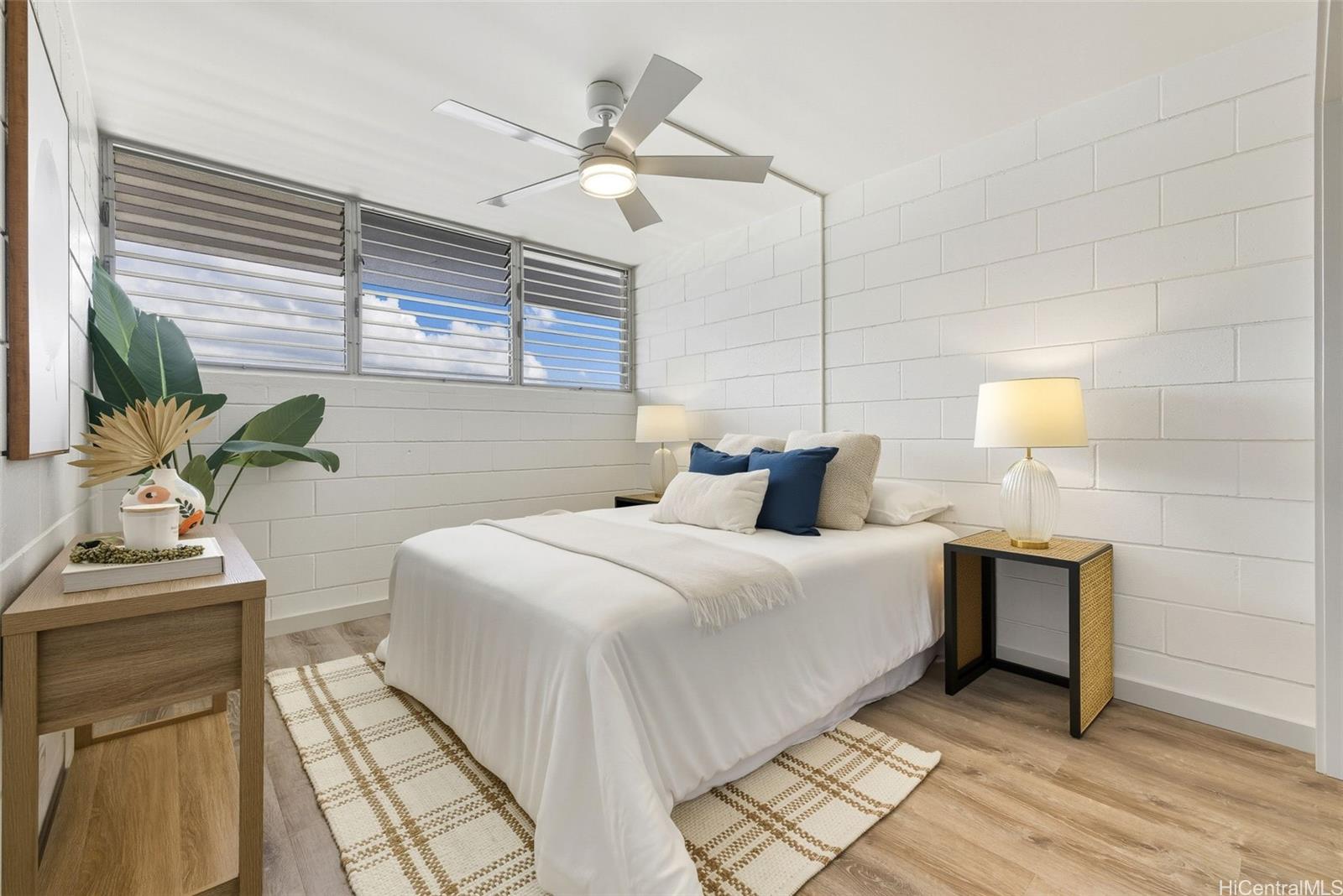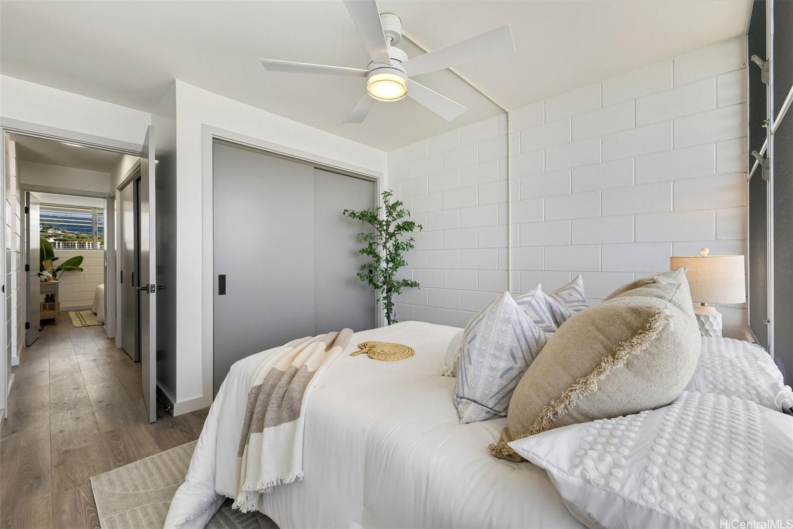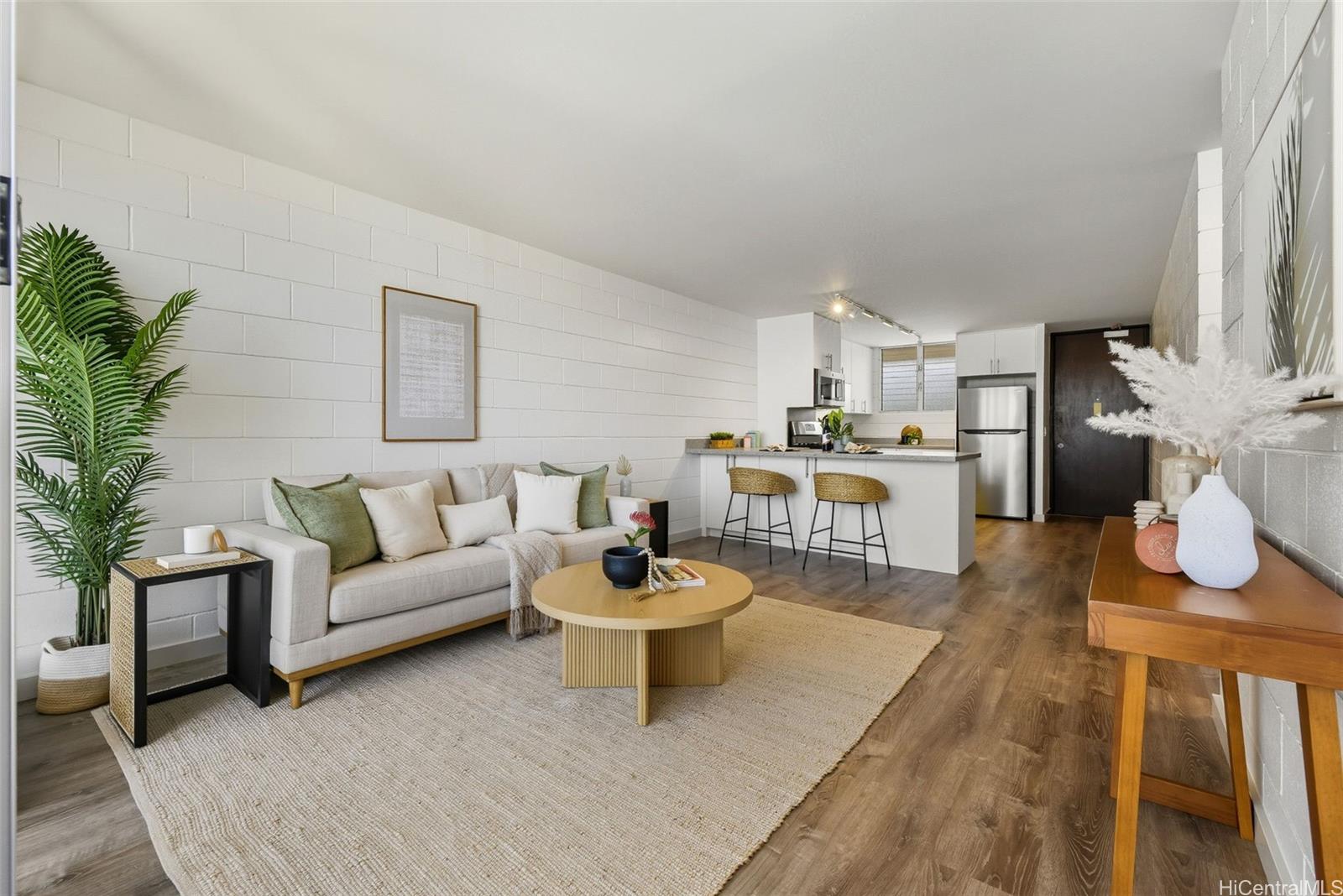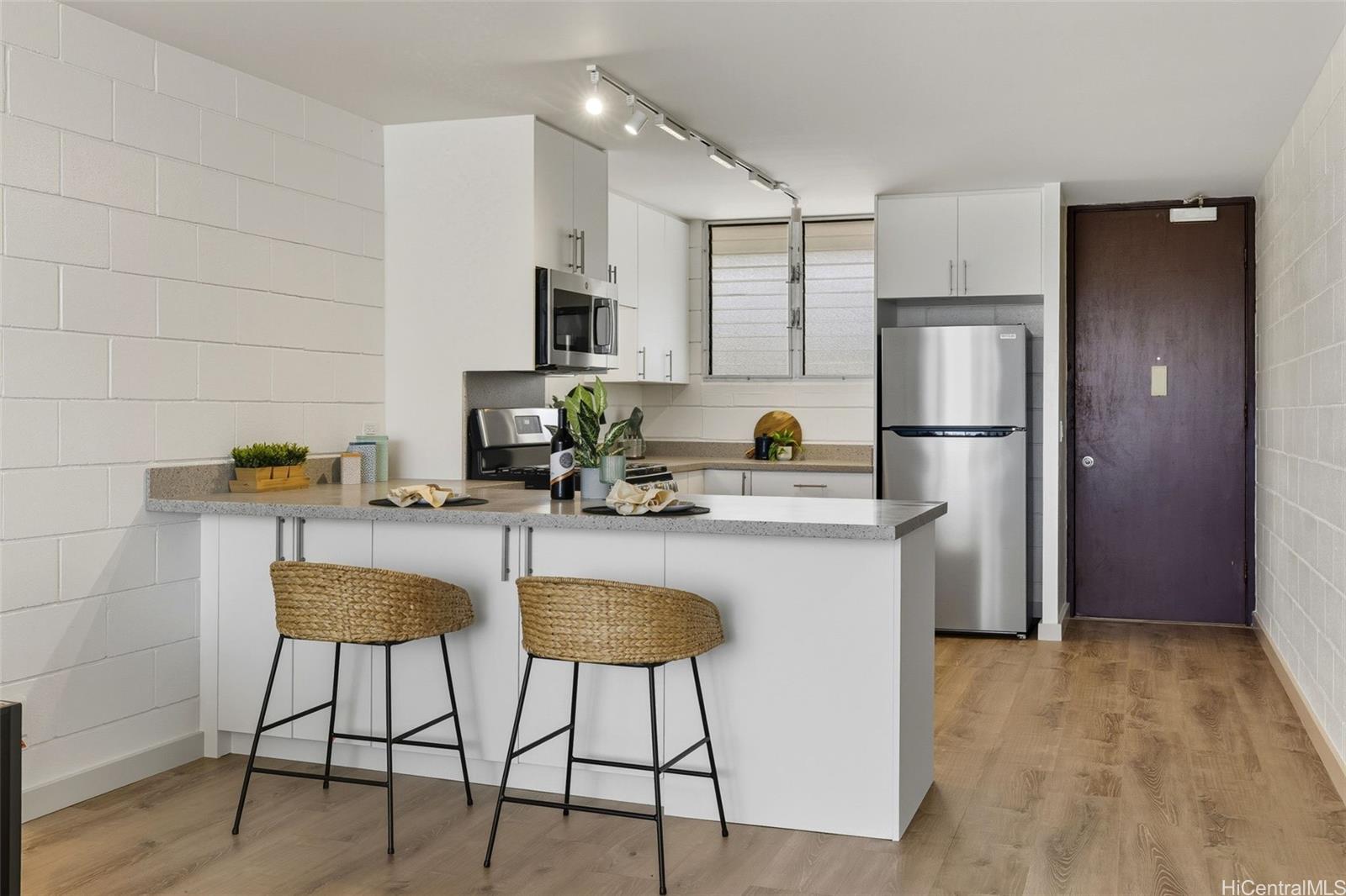Easy to show! Discover this fully renovated 2-bedroom, 1-bath condo at Holiday Parkway, a stylish retreat in the heart of Honolulu. Step inside to bright, airy living spaces featuring luxury vinyl plank flooring, a modern white kitchen with solid quartz countertops, and stainless steel appliances. Thoughtful details like ceiling fans and plenty of closet storage add everyday comfort.