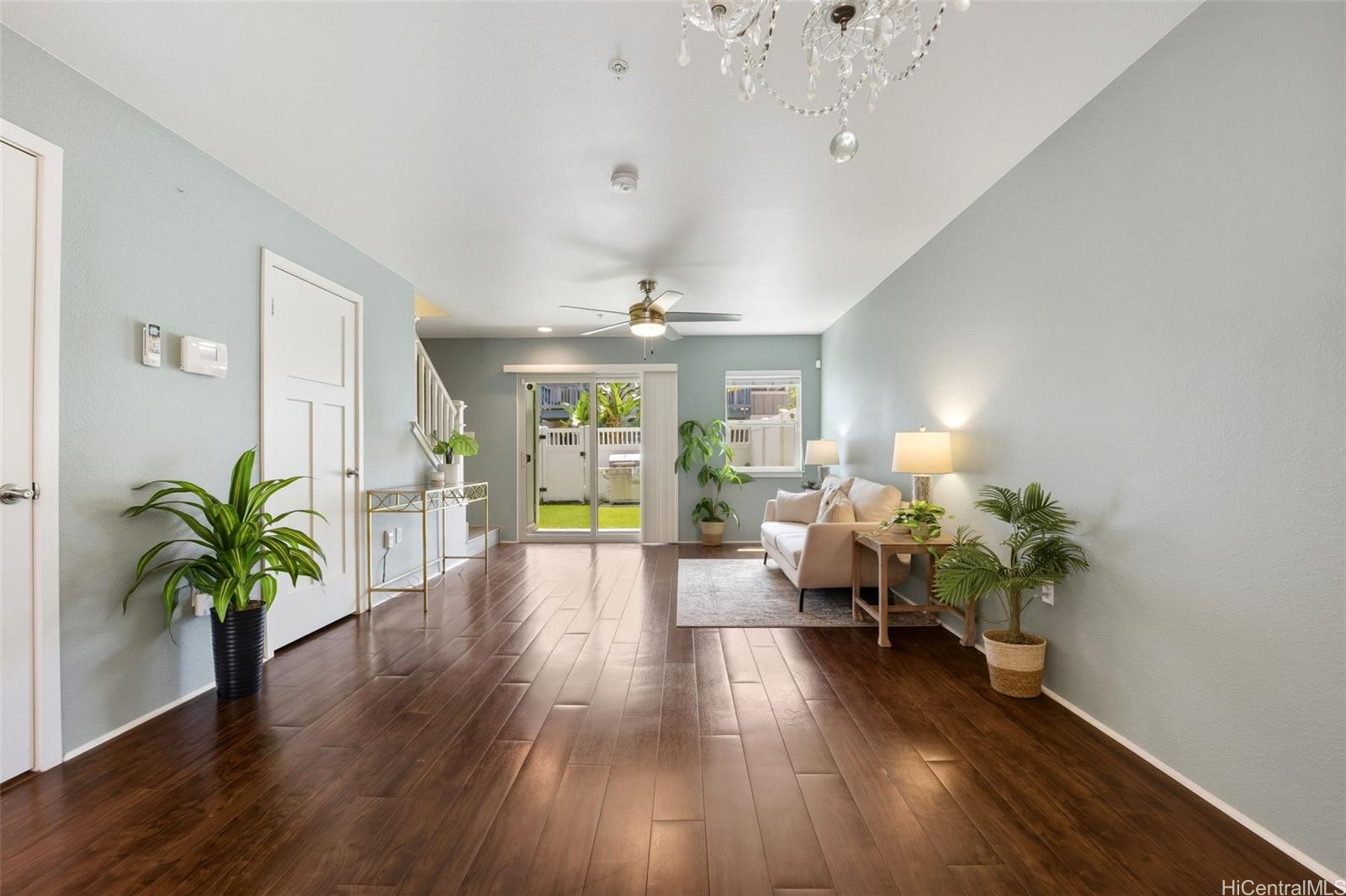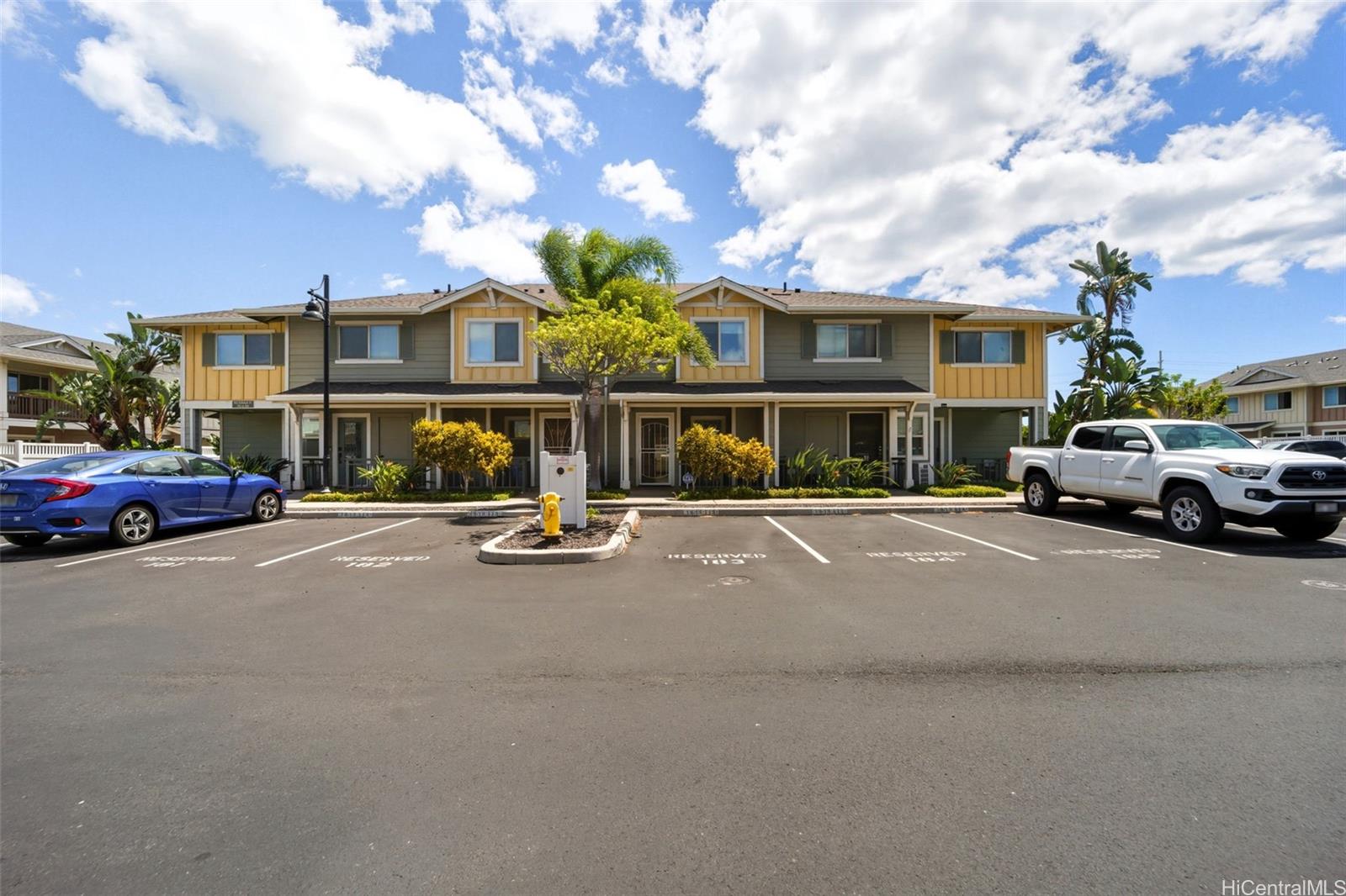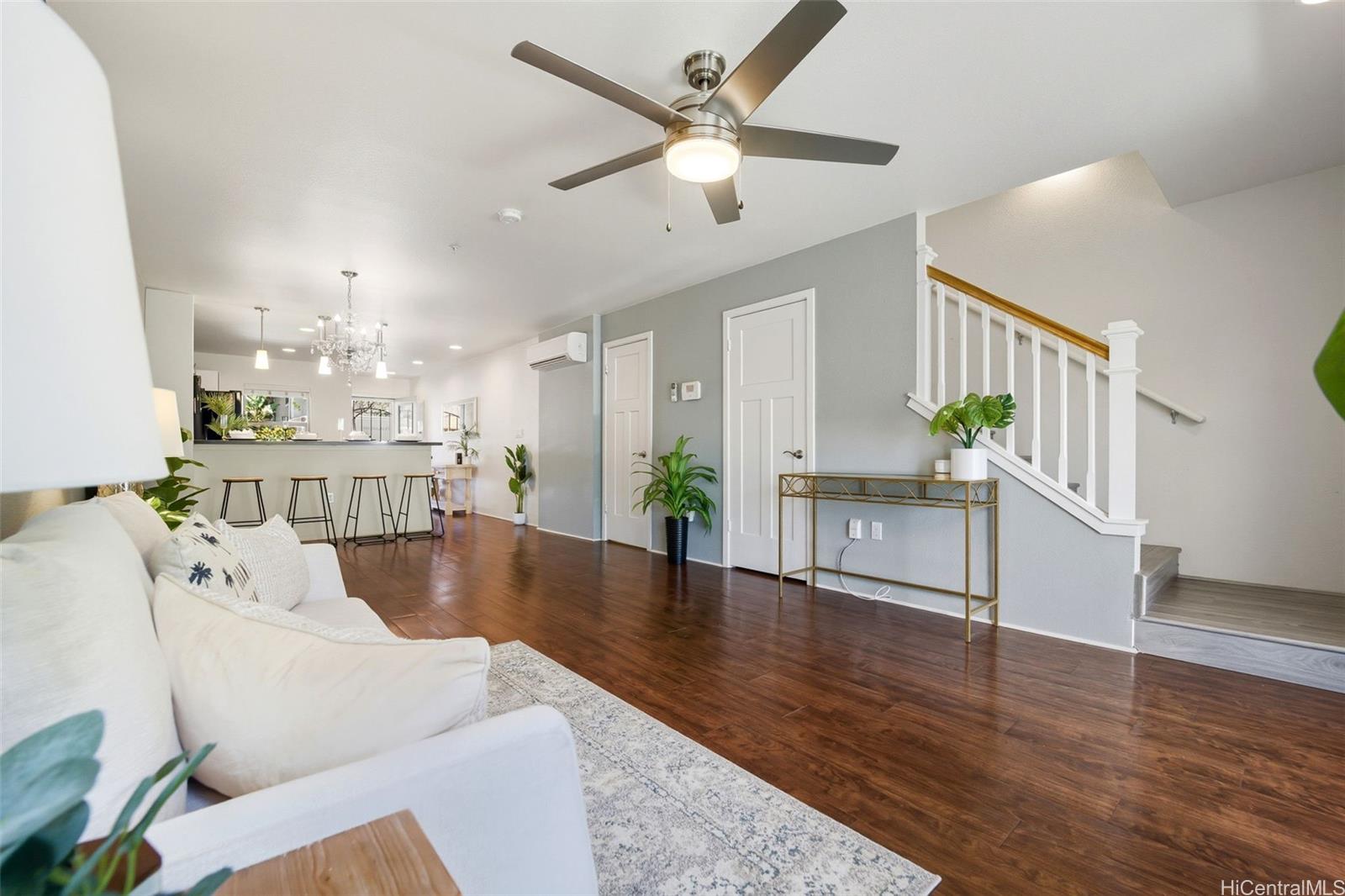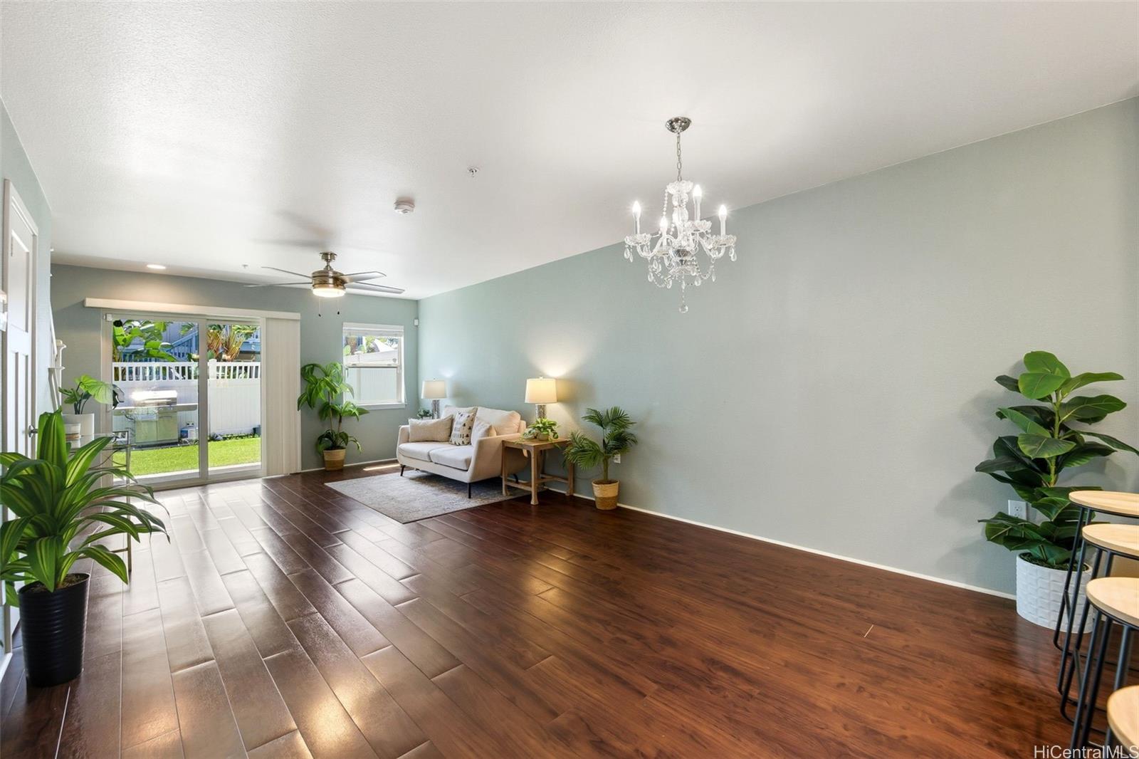 Rarely available in Mehana Olino! This one of a kind 2 story townhome has NO unit above or below and boasts one of the lowest maintenance fees in Kapolei, all while giving you the lifestyle you’ve been looking for. Featuring 2 full bathrooms upstairs, a convenient ½ bath downstairs, and 2 assigned parking stalls just steps away. Enjoy your own private backyard with low maintenance synthetic turf and a cozy lanai, perfect for relaxing or entertaining. Inside, you’ll love the upgraded luxury vinyl plank flooring throughout, Corian kitchen counters, shaker cabinets, and newer appliances (dishwasher, washer, dryer). Split A/C units are installed in every room and living area to keep the home cool and comfortable year round, especially on the cooler side of the community.
